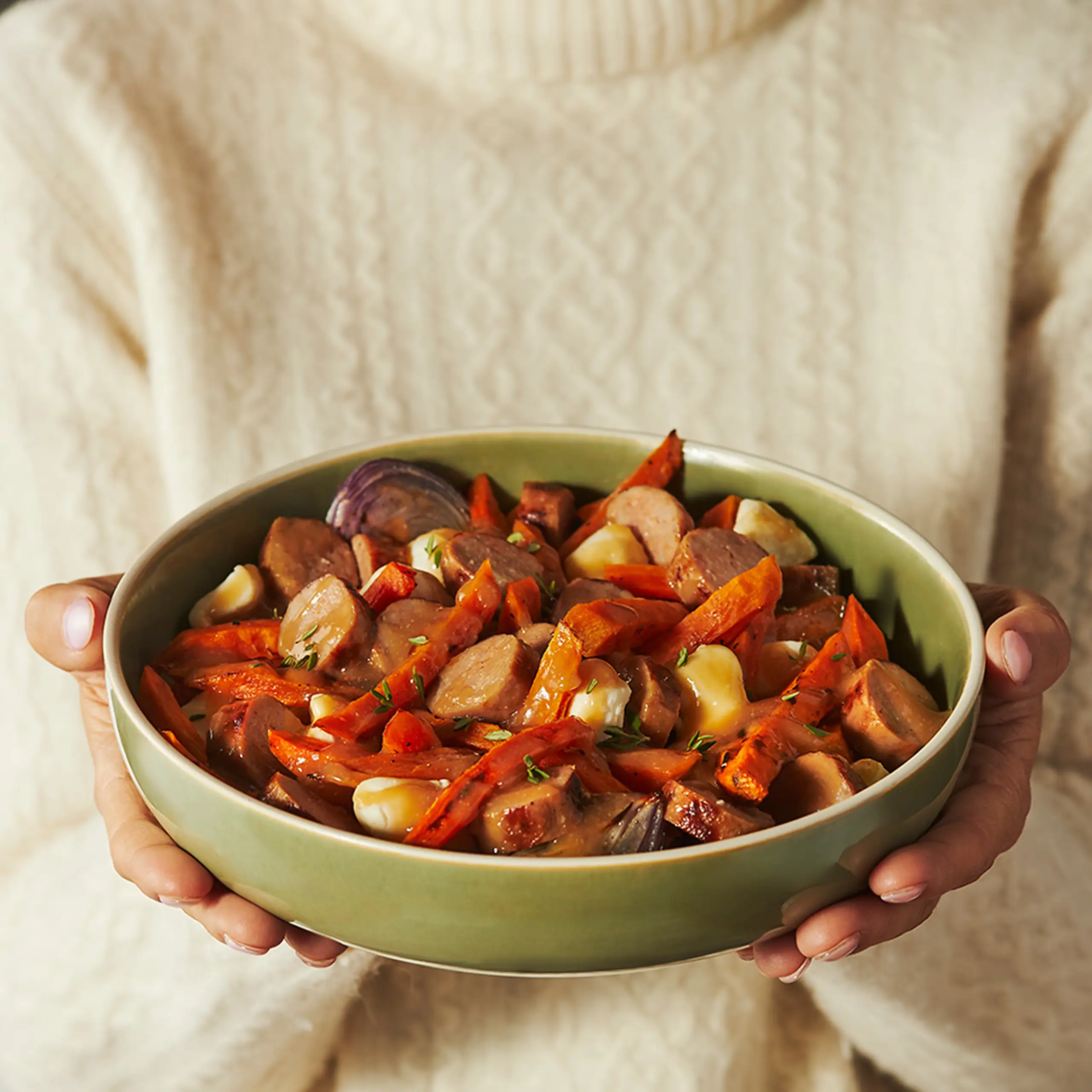 Découvrez les recettes en lien avec ces conseils sur l'art de la table : Poutine réconfortante aux patates douces, carottes et saucisses, avec sauce miso et érable